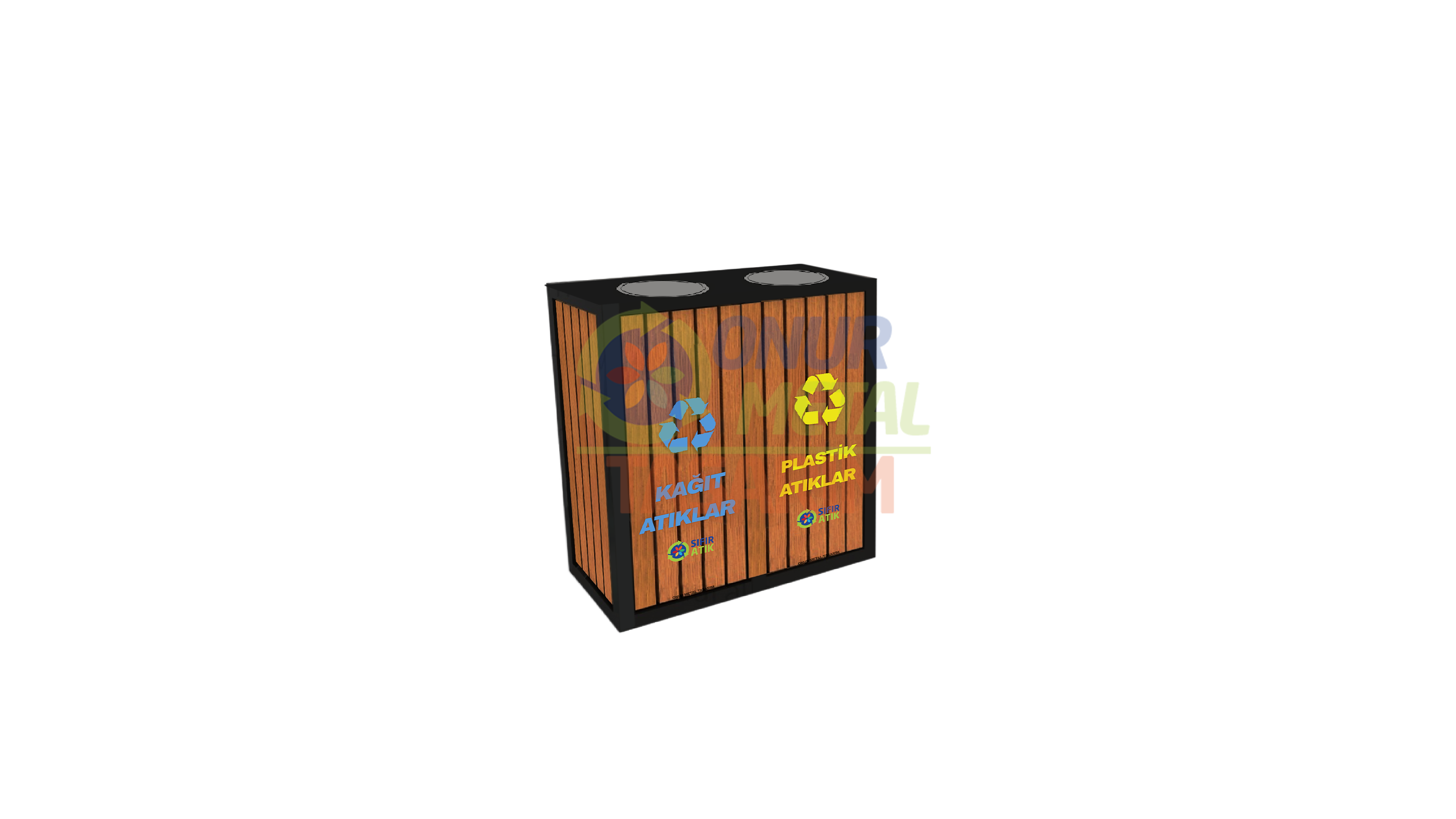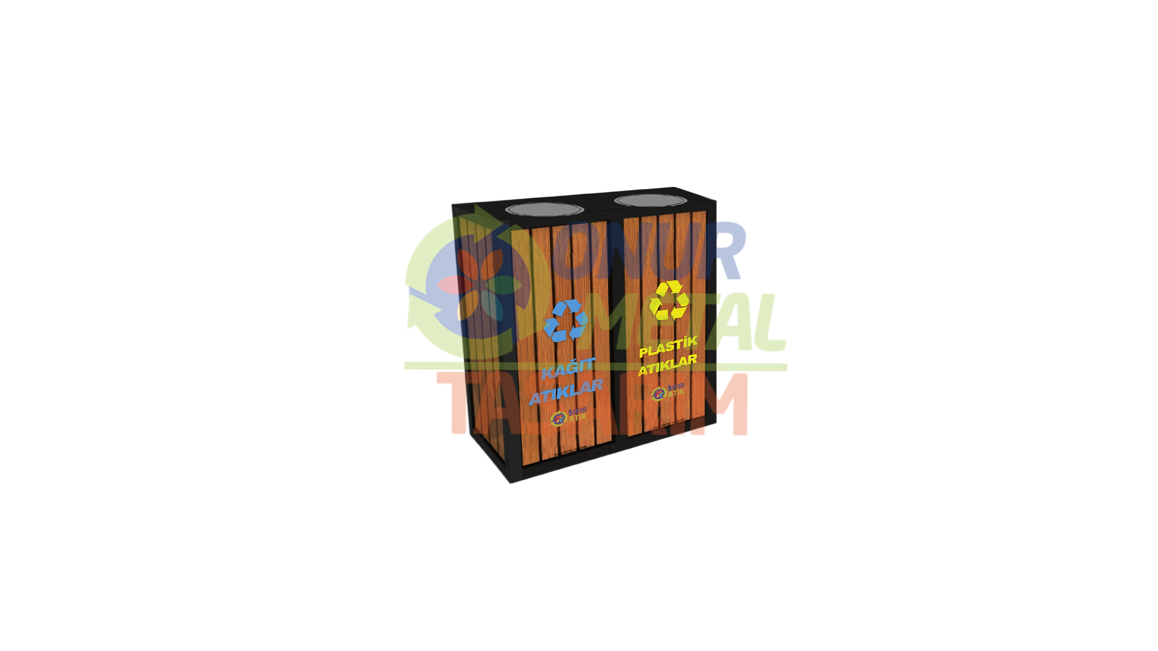 OMT-124 Ahşap Profilli Döner Kapaklı 2’li Geri Dönüşüm Çöp Kutusu