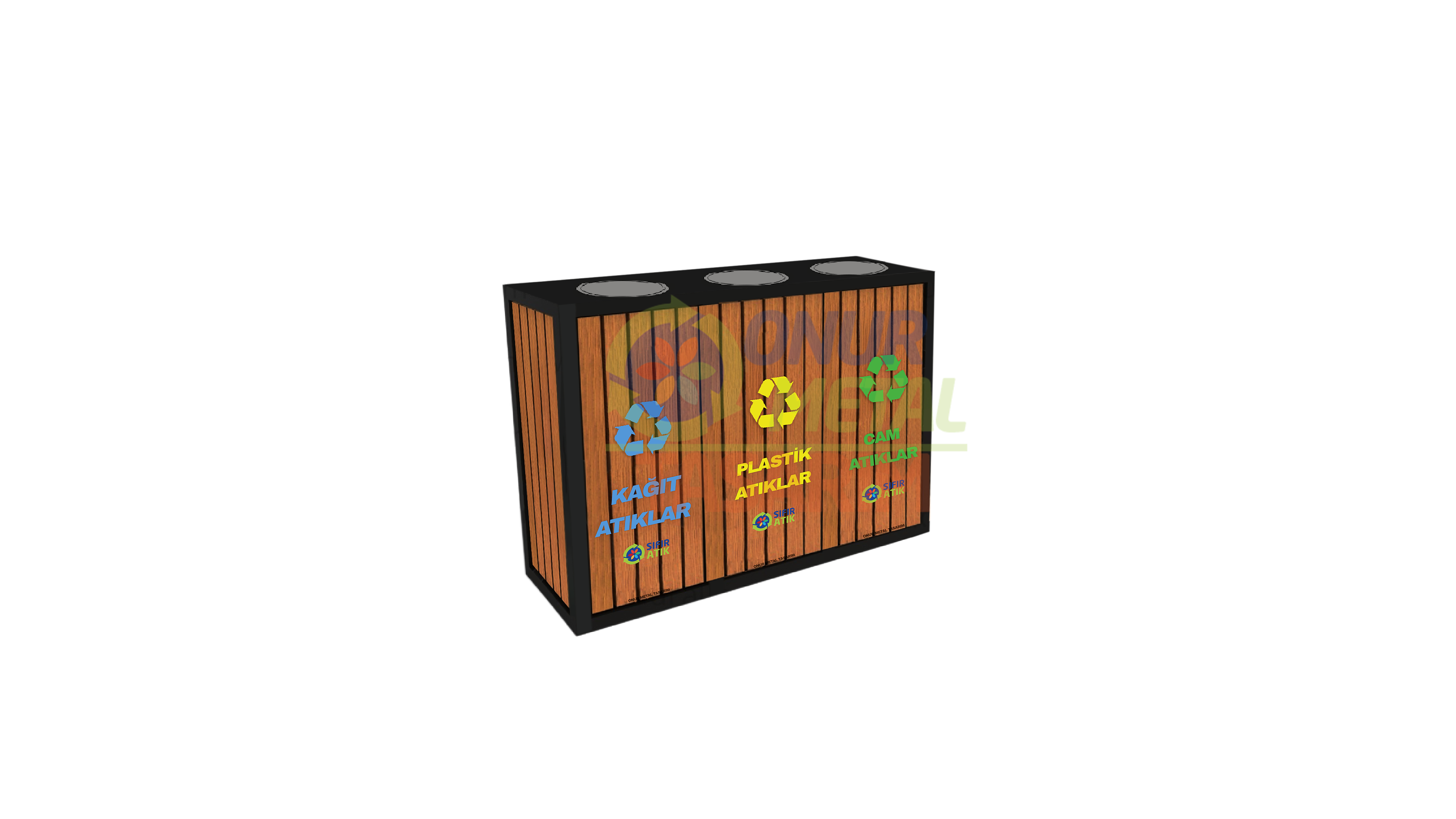 OMT-124-B Ahşap Profilli Döner Kapaklı 3’lü Geri Dönüşüm Çöp Kutusu